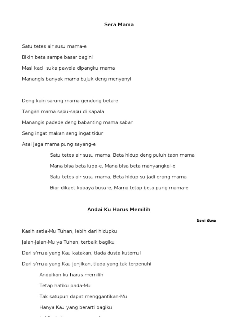 Sakarang mama su seng ada lai beta ana satu areng. Pada minggu ini lagu marhaban ya ramadhan milik haddad alwi ft anti menjadi peringkat satu, mabuk kepayang milik tangga menjadi peringkat dua, pergi rasa yang tertinggal, rasa (baca selanjutnya. Berapa puluh tahun lalu beta masih kacil e beta inga tempo itu, mama gendong, gendong betae. Am ~ c ~ am g f ~ c ~ hoo ~ houo ~ f c dingin ~ di malam ini g c sandiri beta di dalam kamar ini f c su pigi ~ yang beta sayangi d g kastinggal beta deng rasa cinta ini ~ *) f c masih ~ di dalam hati g seng akang pernah berhenti c untuk mencintai ~ f am mangapa ~ harus secepat ini d tuhan ambil ale g dar beta pung hidup ini ~ reff: Satu tetes air susu mama e, biking beta sampe basar bagini, masi kacil kincing bera di pangku mama manangis banya mama buju deng manyanyi deng kaeng sarung m2 dukung b e, Lagu ini juga pernah dipopulerkan oleh emilia contessa dan mendiang glenn fredly. a e d chords for satu tetes air susu mama (elke) with song key, bpm, capo transposer, play along with guitar, piano, ukulele & mandolin. F c g c f c g c f g c f c do'e. Lirik, chord lagu ambon 5. Satu tetes aer susu mama ee…. Daftar isi tutup 1 lirik & kunci gitar pasha ungu beta mati rasa. Satu tetes aer susu…subahanallah.lagunya bagus banget, liriknya juga bagus, kalo denger sambil dihayati lagunya, pasti mata kalian para agan2 pada banjir, ….lagu ini pertama kali dinyanyiin sama mendiang leo colling, kemudian dinyanyiin lagi sama adik arjuna, anak sdn maliaro yang pernah diundang nyanyi sama presiden sby di. intro c em f g 2x c em tetes air mata basahi pipimu f g di saat kita 'kan berpisah c em terucapkan janji padamu kasihku f g takkan kulupakan dirimu * f g c f g c begitu beratnya kaulepas diriku